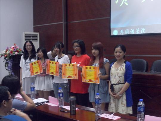 评比开展前,章彩玲同学上台为大家展示了此次暑期社会实践的总体情况,对此次活动做出了精彩的总结。接下来,主持人介绍了此次比赛的评分细则:PPT展示评分由评委评分和大众投票组成,在所有队伍展示完之后,公布PPT展示得分,而最终成绩则在日后公布。之后,九支队伍按照顺序依次上场介绍。每支队伍都根据实践报告精心制作了PPT,为评委和观众全面介绍了从前期准备、中期实践再到活动成果等实践各方面的内容。每位主讲人用他们流利的语言、充满创意的幻灯片以及丰富多彩的活动图片,将大家带入了实践的活动当中。当天活动现场有许多13级的新生,主讲人们也纷纷鼓励这些新生们加入到暑期实践中来,并希望他们做得更好。此次暑期实践活动的主题也是多种多样,既有研究调查社会现状的,也有进行志愿活动的,还有调查职场文化的,可谓是精彩纷呈。此外,还有队伍准备了实践视频,记录下实践的难忘片段。在所有队伍展示完之后,工作人员收集了在场观众的投票,经过紧张的统计,得出了此次PPT展示的得分。这个分数也将和实践报道、媒体宣传等分数相加,得出最终成绩。之后,外院青协的郭小玲同学上台为大家介绍了一年来青协的工作和成果,让大家都看到了青协成员和志愿者们的努力和付出。最后一个环节,是优秀志愿者的表彰环节,评委们为这些优秀志愿者颁发奖状,以表扬和肯定他们在这次活动中的努力。