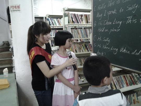 课。她们首先让小朋友一起跟读课文,再分角色朗读,富有节奏感的带读使课堂气氛活跃不少,在志愿者的鼓励下,孩子们还尝试将课文翻译成中文。为了便于同学们记忆,志愿者们通过反复朗读,并在卡片的帮助下让孩子们不断练习所学内容。对于新短语的出现,志愿者也通过形象的解释让孩子们能更好的理解。新句型的掌握对于他们是个难题,志愿者们便将句型写在黑板上并鼓励大家自己照着模板造句,这对他们虽然有难度,但仍有不少孩子踊跃参与。在今天的课堂上,为了激励小朋友积极参与课堂活动,老师们还准备了糖果,小小的奖励也让小朋友更多的体会到了学习的乐趣。